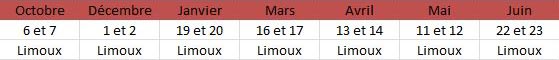 | 10 et 11 mars | Domaine de ninaute LIMOUX | WE EFYMP 4eme cycle | Françoise MAZET. 05 61 21 26 85 / 06 10 25 07 56 Dominique GERIN 06 61 74 21 05 / 05 62 26 47 69 |